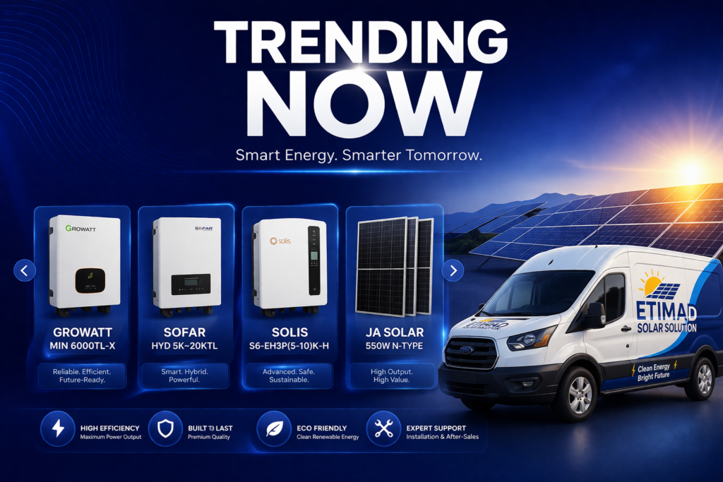 Etimad Solar provides premium solar panels, solar inverters, lithium batteries, and solar accessories that deliver reliable performance and long-lasting durability. Using high-quality materials ensures lower maintenance costs and a longer lifespan for your solar power system.